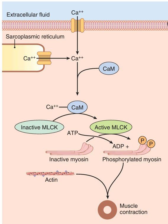 Intracellular calcium ion (Ca++) concentration increases when Ca++ enters the cell through calcium channels in the cell membrane or is released from the sarcoplasmic reticulum. The Ca++ binds to calmodulin (CaM) to form a Ca++-CaM complex, which then activates myosin light chain kinase (MLCK). The active MLCK phosphorylates the myosin light chain leading to attachment of the myosin head with the actin filament and contraction of the smooth muscle. ADP, adenosine diphosphate; ATP, adenosine triphosphate; P, phosphate.