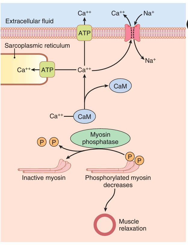 Relaxation of smooth muscle occurs when calcium ion (Ca++) concentration decreases below a critical level as Ca++ is pumped out of the cell or into the sarcoplasmic reticulum. Ca++ is then released from calmodulin (CaM) and myosin phosphatase removes phosphate from the myosin light chain, causing detachment of the myosin head from the actin filament and relaxation of the smooth muscle. ADP, adenosine diphosphate; ATP, adenosine triphosphate; Na+, sodium; P, phosphate.