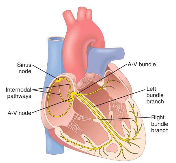 Sinus node and the Purkinje system of the heart, showing also the atrioventricular (A-V) node, atrial internodal pathways, and ventricular bundle branches.