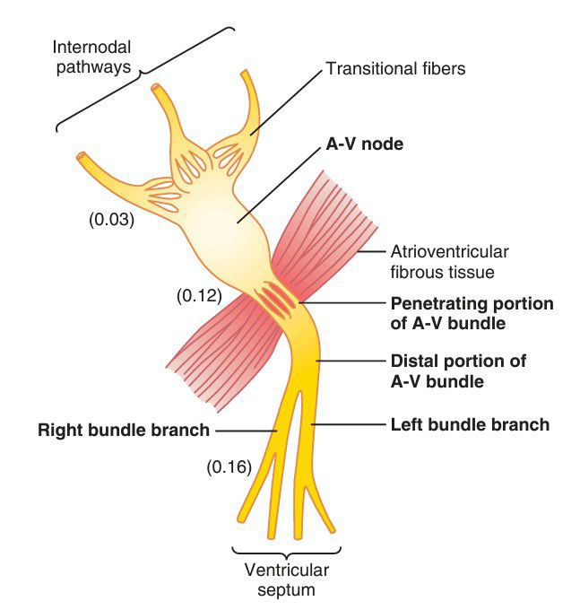 The numbers represent the interval of time from the origin of the impulse in the sinus node. The values have been extrapolated to human beings.