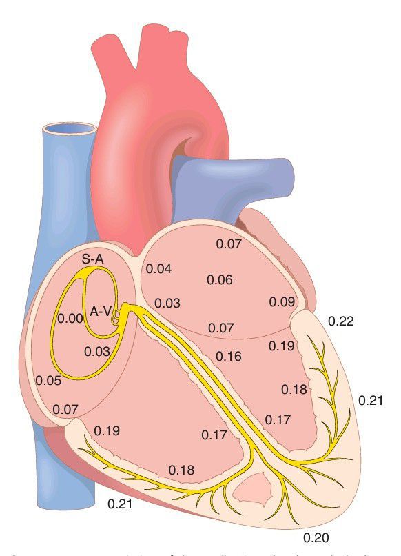 Transmission of the cardiac impulse through the heart, showing the time of appearance (in fractions of a second after initial appearance at the sinoatrial node) in different parts of the heart. A-V, atrioventricular; S-A, sinoatrial.