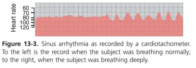 Sinus arrhythmia as recorded by a cardiotachometer. To the left is the record when the subject was breathing normally; to the right, when the subject was breathing deeply.