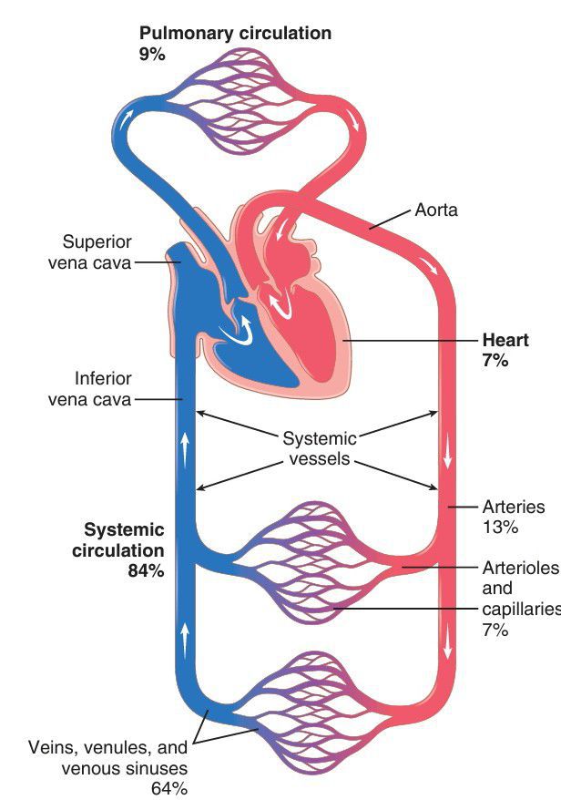 Distribution of blood (in percentage of total blood) in the different parts of the circulatory system.