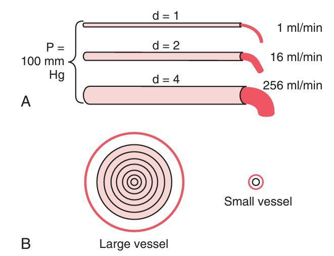 Concentric rings of blood flowing at different veloci ties; the farther away from the vessel wall, the faster the flow. d, diameter; P, pressure difference between the two ends of the vessels.
