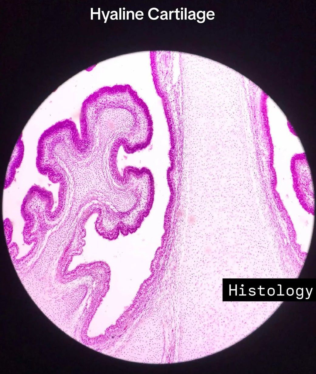 This type of cartilage has a glassy appearance when fresh, hence its name, as hyalos is greek for glassy. It looks slightly basophilic overall in H&E sections. Hyaline cartilage has widely dispersed fine collagen fibres (type II), which strengthen it. The collagen fibres are hard to see in sections.
