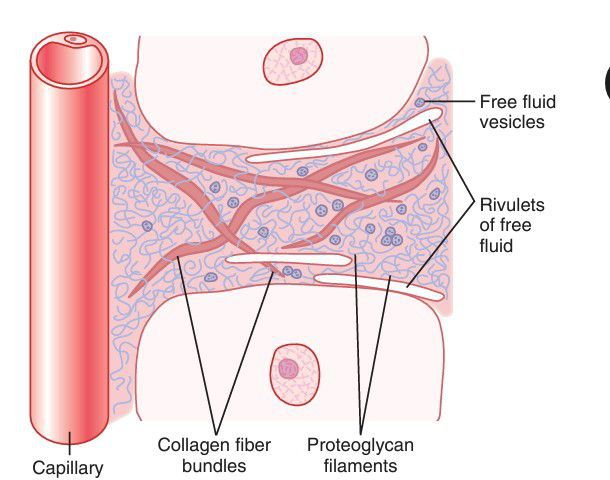 Proteoglycan filaments are everywhere in the spaces between the collagen fiber bundles. Free fluid vesicles and small amounts of free fluid in the form of rivulets occasionally also occur.