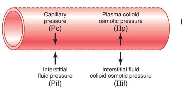 Fluid pressure and colloid osmotic pressure forces operate at the capillary membrane and tend to move fluid either outward or inward through the membrane pores.