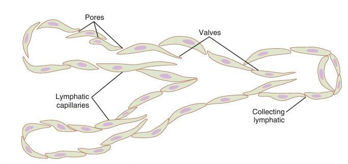 Structure of lymphatic capillaries and a collecting lymphatic, with the lymphatic valves also shown.