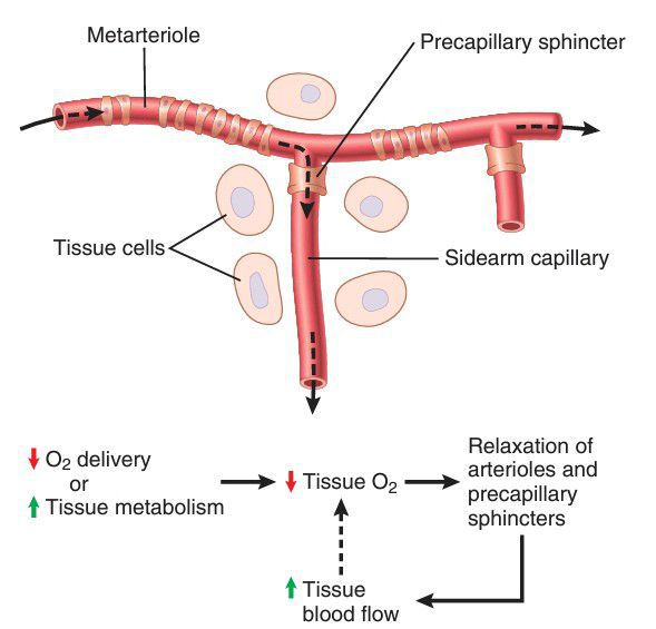 Diagram of a tissue unit area for explanation of acute local feedback control of blood flow, showing a metarteriole passing through the tissue and a sidearm capillary with its precapillary sphincter for controlling capillary blood flow.