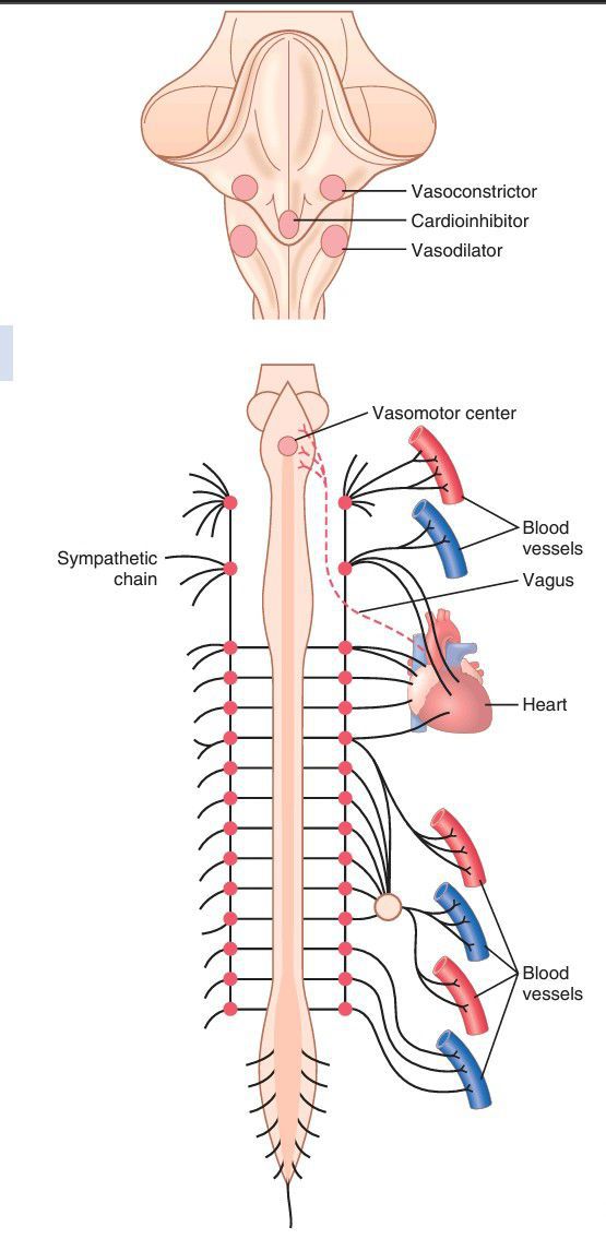 Anatomy of sympathetic nervous control of the circulation. Also shown by the dashed red line, a vagus nerve that carries parasympathetic signals to the heart.