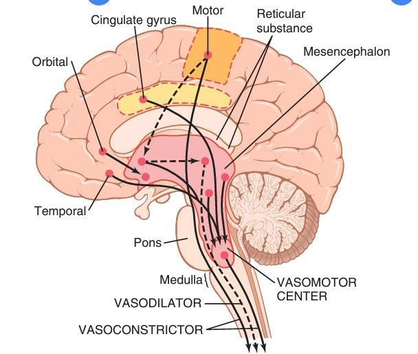 Areas of the brain that play important roles in the nervous regulation of the circulation. The dashed lines represent inhibitory pathways.