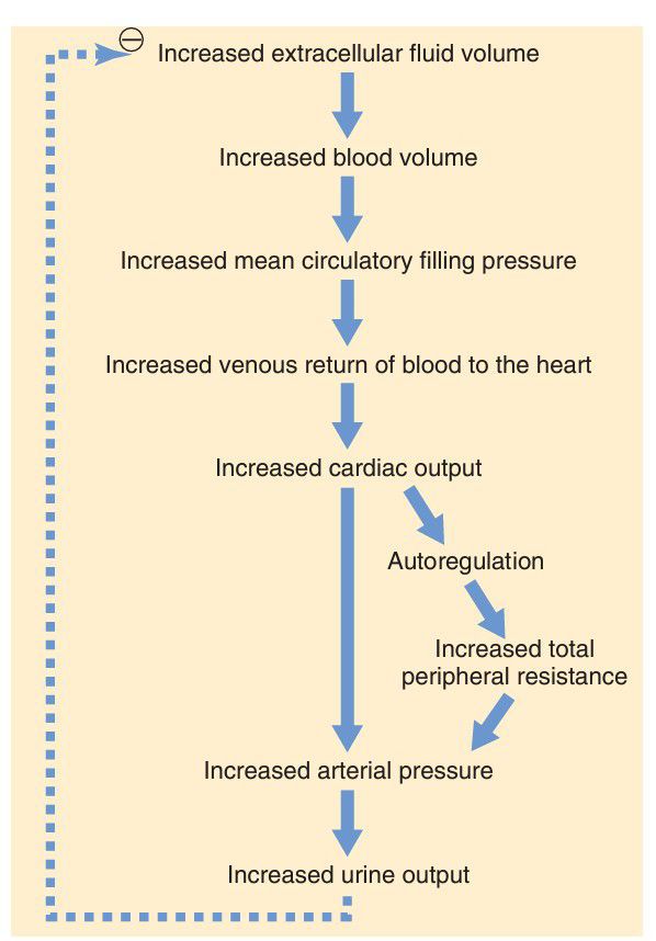 Sequential steps by which increased extracellular fluid volume increases the arterial pressure. Note especially that increased cardiac output has both a direct effect to increase arterial pressure and an indirect effect by first increasing the total peripheral resistance.