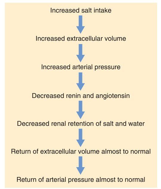 Sequential events by which increased salt intake increases the arterial pressure, but feedback decrease in activity of the renin angiotensin system returns the arterial pressure almost to the normal level.