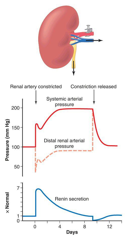 . The effect of placing a constricting clamp on the renal artery of one kidney after the other kidney has been removed. Note the changes in systemic arterial pressure, renal artery pressure distal to the clamp, and rate of renin secretion. The resulting hypertension is called “one-kidney” Goldblatt hypertension.