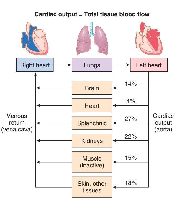 Cardiac output is equal to venous return and is the sum of tissue and organ blood flows. Except when the heart is severely weakened and unable to adequately pump the venous return, cardiac output (total tissue blood flow) is determined mainly by the metabolic needs of the tissues and organs of the body.