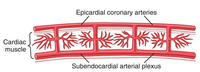 Diagram of the epicardial, intramuscular, and subendocardial coronary vasculature.