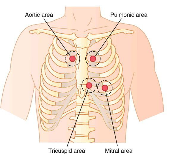 Chest areas from which sound from each valve is best heard.