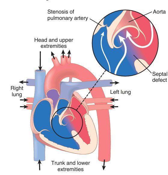 Tetralogy of Fallot, showing by the blue color that most of the venous blood is shunted from the right ventricle into the aorta without passing through the lungs.