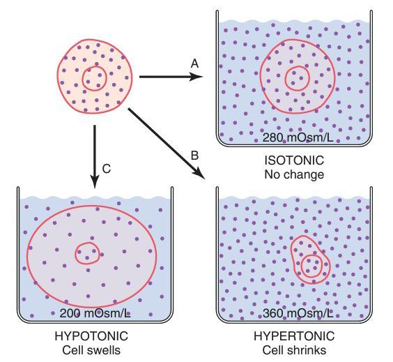 Effects of isotonic (A), hypertonic (B), and hypotonic (C) solutions on cell volume.