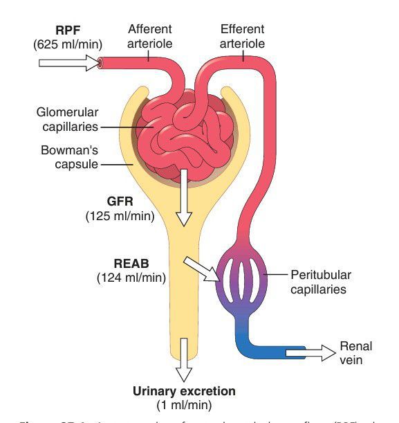 Average values for total renal plasma flow (RPF), glomerular filtration rate (GFR), tubular reabsorption (REAB), and urine f low rate. RPF is equal to renal blood flow × (1 – Hematocrit). Note that GFR averages about 20% of the RPF, while urine flow rate is less than 1% of the GFR. Therefore, more than 99% of the fluid f iltered is normally reabsorbed. The filtration fraction is the GFR/RPF.