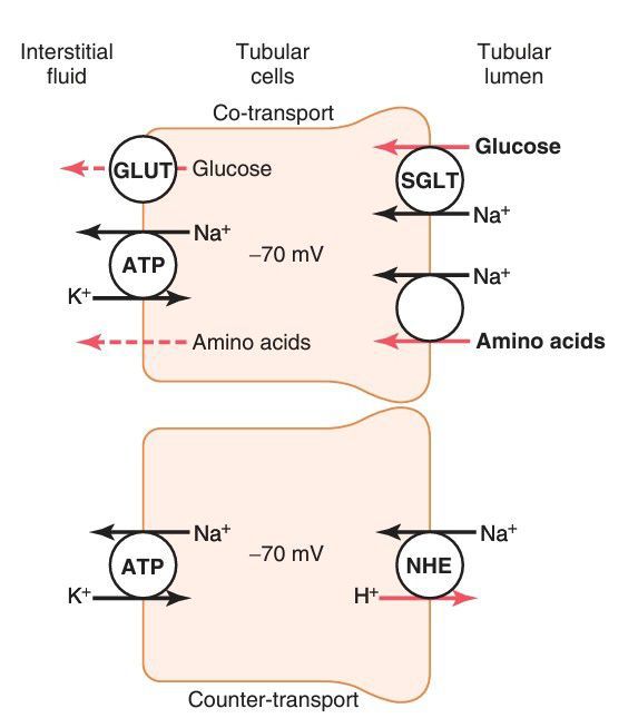 The upper cell shows the co-transport of glucose and amino acids along with sodium ions through the apical side of the tubular epithelial cells, followed by facilitated diffusion through the basolateral membranes. The lower cell shows the counter-transport of hydrogen ions from the interior of the cell across the apical membrane and into the tubular lumen; movement of sodium ions into the cell, down an electrochemical gradient established by the sodium-potassium pump on the basolateral membrane, provides the energy for transport of the hydrogen ions from inside the cell into the tubular lumen. ATP, adenosine triphosphate; GLUT, glucose transporter; NHE, sodium- hydrogen exchanger; SGLT, sodium-glucose co-transporter.