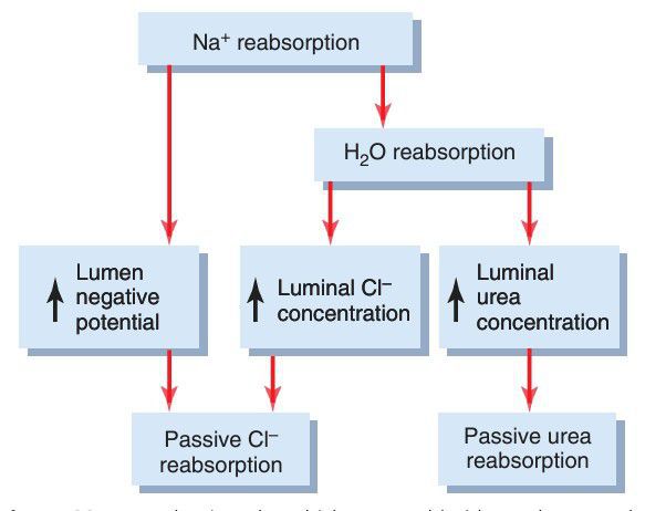 Mechanisms by which water, chloride, and urea reabsorption are coupled with sodium reabsorption.