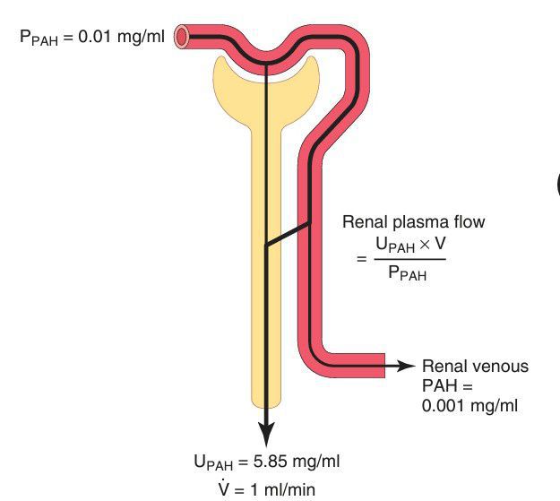 Measurement of renal plasma flow from the renal clearance of para-aminohippuric acid (PAH). PAH is freely filtered by the glomerular capillaries and is also secreted from the peritubular capillary blood into the tubular lumen. The amount of PAH in the plasma of the renal artery is about equal to the amount of PAH excreted in the urine. Therefore, the renal plasma flow can be calculated from the clearance of PAH. To be more accurate, one can correct for the percentage of PAH that is still in the blood when it leaves the kidneys. PPAH, arterial plasma PAH concentration; UPAH, urine PAH concentration; V, urine flow rate.