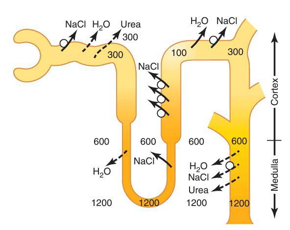 Formation of a concentrated urine when antidiuretic hormone (ADH) levels are high. Note that the fluid leaving the loop of Henle is dilute but becomes concentrated as water is absorbed from the distal tubules and collecting tubules. With high ADH levels, the osmolarity of the urine is about the same as the osmolarity of the renal medullary interstitial fluid in the papilla, which is about 1200 mOsm/L. (Numerical values are in milliosmoles per lite