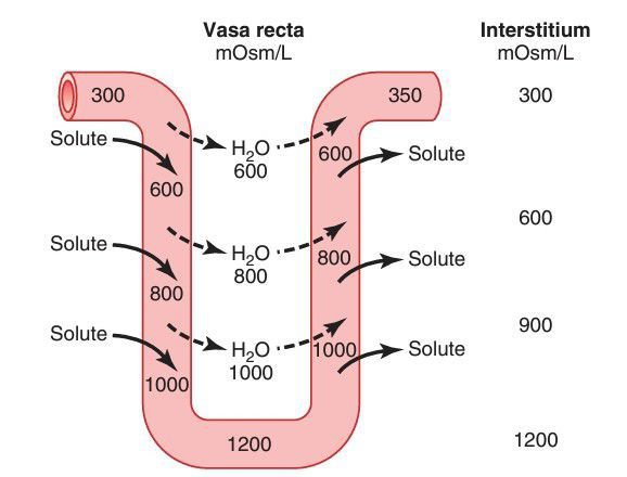Plasma f lowing down the descending limb of the vasa recta becomes more hyperosmotic because of diffusion of water out of the blood and diffusion of solutes from the renal interstitial fluid into the blood. In the ascending limb of the vasa recta, solutes diffuse back into the interstitial fluid and water diffuses back into the vasa recta. Large amounts of solutes would be lost from the renal medulla without the U shape of the vasa recta capillaries. (Numerical values are in milliosmoles per liter.)