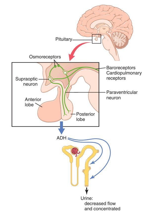 Neuroanatomy of the hypothalamus, where antidiuretic hormone (ADH) is synthesized, and the posterior pituitary gland, where ADH is released.