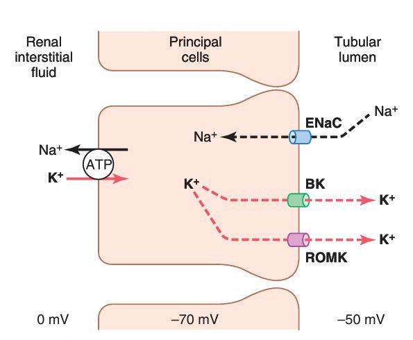 Mechanisms of potassium secretion and sodium reab sorption by the principal cells of the late distal and collecting tubules. BK, “big” potassium channel; ENaC, epithelial sodium channel; ROMK, renal outer medullary potassium channel.