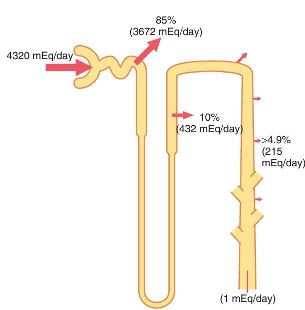 Reabsorption of bicarbonate in different segments of the renal tubule. The percentages of the filtered load of HCO3 − absorbed by the various tubular segments are shown, as well as the number of milliequivalents reabsorbed per day under normal conditions.