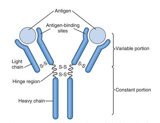 Structure of the typical IgG antibody, showing it to be composed of two heavy polypeptide chains and two light polypeptide chains. The antigen binds at two different sites on the variable portions of the chains.