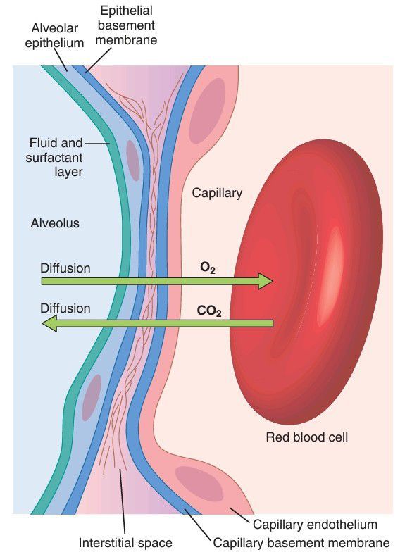 Ultrastructure of the alveolar respiratory membrane, shown in cross section.