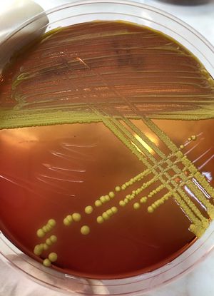Yellow colonies of Micrococcus luteus on blood agar