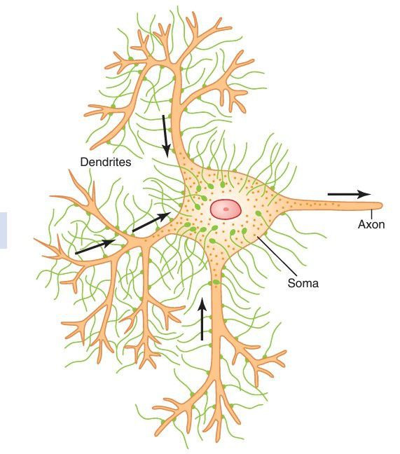 A typical anterior motor neuron showing presynaptic terminals on the neuronal soma and dendrites. Note also the single axon.