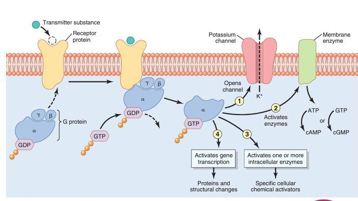 . The “second messenger” system by which a transmitter substance from an initial neuron can activate a second neuron by first causing a transformational change in the receptor that releases the activated alpha (α) subunit of the G protein into the second neuron’s cytoplasm. Four subsequent possible effects of the G protein are shown, including 1, opening an ion channel in the membrane of the second neuron; 2, activating an enzyme system in the neuron’s membrane; 3, activating an intracellular enzyme system; and/or 4, causing gene transcription in the second neuron. Return of the G protein to the inactive state occurs when guanosine triphosphate (GTP) bound to the α subunit is hydrolyzed to guanosine diphosphate (GDP) and the β and γ subunits are reattached to the α subunit.