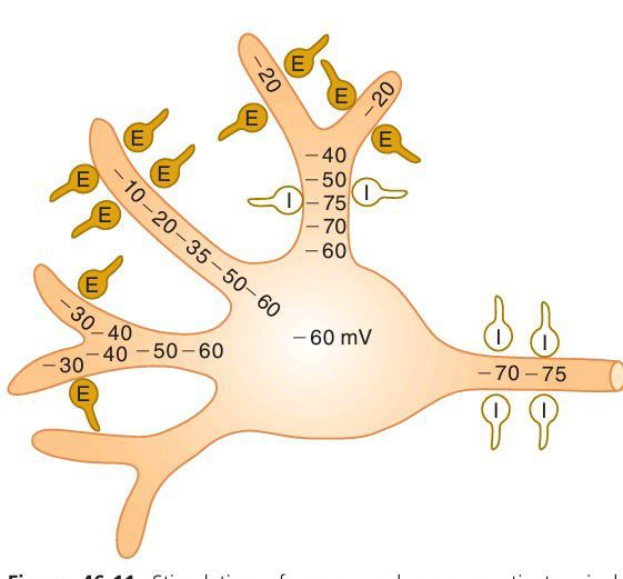 Stimulation of a neuron by presynaptic terminals located on dendrites, showing, especially, decremental conduction of excitatory (E) electrotonic potentials in the two dendrites to the left and inhibition (I) of dendritic excitation in the dendrite that is uppermost. A powerful effect of inhibitory synapses at the initial segment of the axon is also shown.