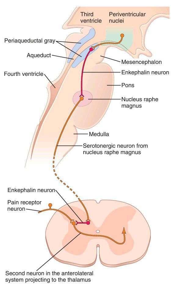 Analgesia system of the brain and spinal cord, showing (1) inhibition of incoming pain signals at the cord level and (2) presence of enkephalin-secreting neurons that suppress pain signals in both the cord and the brain stem.