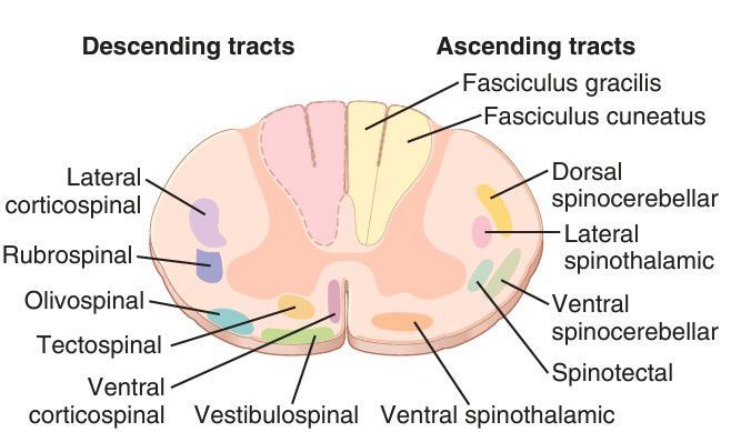 Cross section of the spinal cord, showing principal ascending tracts on the right and principal descending tracts on the left.