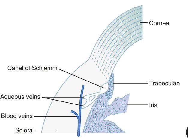 Anatomy of the iridocorneal angle, showing the system for outflow of aqueous humor from the eyeball into the conjunctival veins.