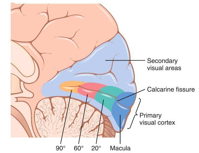 The visual cortex in the calcarine fissure area of the medial occipital cortex.