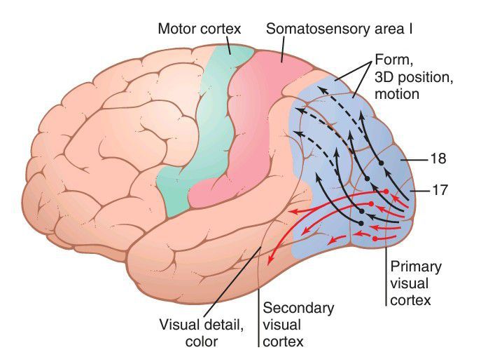Transmission of visual signals from the primary visual cortex into secondary visual areas on the lateral surfaces of the occipital and parietal cortices. Note that the signals representing form, third-dimensional position, and motion are transmitted mainly into the superior portions of the occipital lobe and posterior portions of the parietal lobe. By contrast, the signals for visual detail and color are transmitted mainly into the anteroventral portion of the occipital lobe and the ventral portion of the posterior temporal lobe.