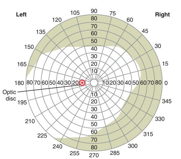 A perimetry chart showing the field of vision for the left eye. The red circle shows the blind spot.
