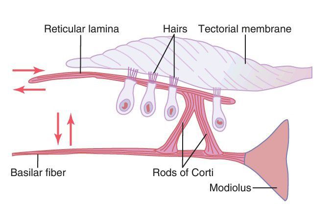 Stimulation of the hair cells by to-and-fro movement of the hairs projecting into the gel coating of the tectorial membrane.