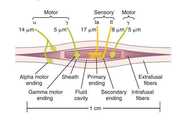 Muscle spindle, showing its relation to the large extrafusal skeletal muscle fibers. Note also both motor and sensory innervation of the muscle spindle