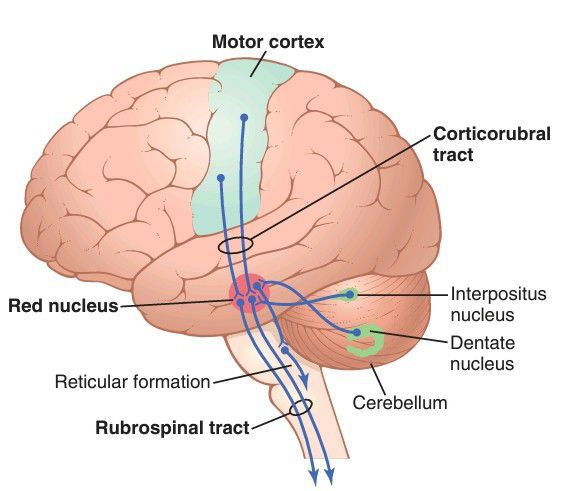 . The corticorubrospinal pathway for motor control, also showing the relation of this pathway to the cerebellum
