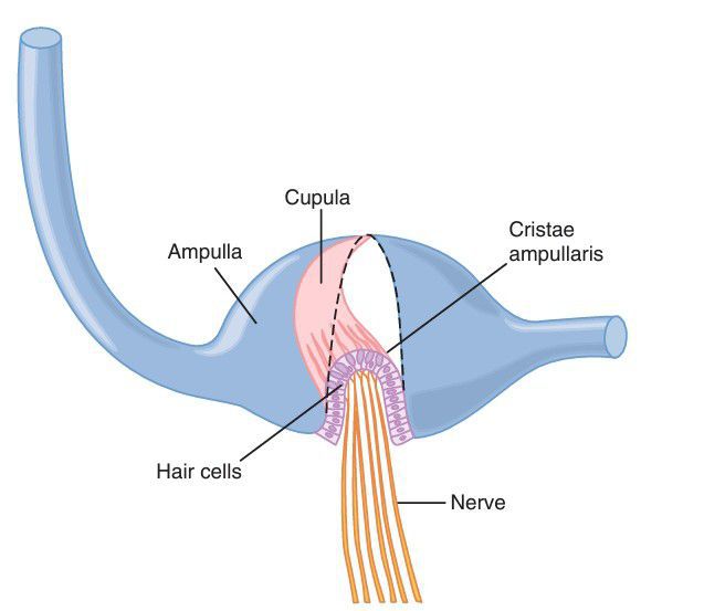 Movement of the cupula and its embedded hairs at the onset of rotation.