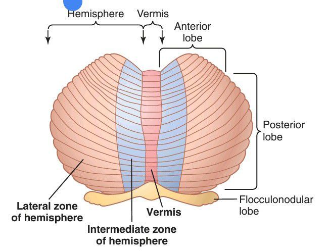Functional parts of the cerebellum as seen from the posteroinferior view, with the inferior-most portion of the cerebellum rolled outward to flatten the surface