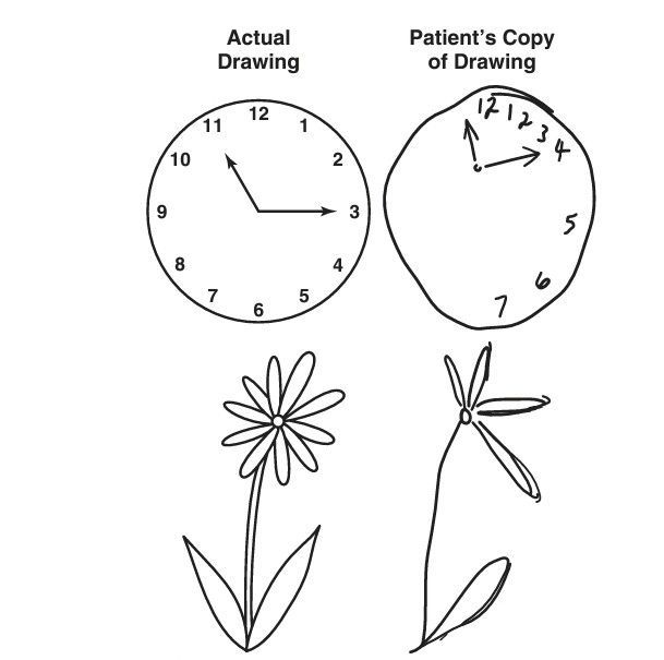 Illustration of drawings that might be made by a person who has neglect syndrome caused by severe damage in his or her right posterior parietal cortex compared with the actual drawing the patient was requested to copy. Note that the person’s ability to copy the left side of the drawings is severely impaired.